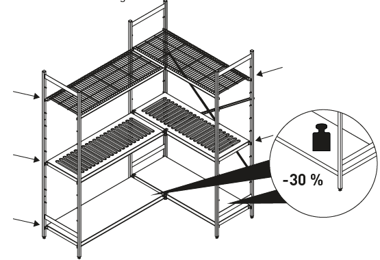 - Die effektive Auflagefläche auf dem Fachboden ist in der Länge (Breite) 60 mm und in der Tiefe 70 mm kleiner als das Nennmaß des Fachbodens, also ergeben sich statt z. B. 600 mm lang x 400 mm tief nur 540 mm lang x 330 mm tief. Dies resultiert aus der flexiblen Einhängbarkeit der Fachböden.