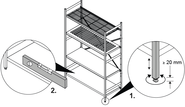 - Hygienische Abdichtung der Ständer durch höhenverstellbare Schraubfüße (20 mm Höhenverstellbarkeit) und obere Abschlusskappen aus Kunststoff, dadurch im Gegensatz zu Steckregalsystemen komplett geschlossene Oberfläche an den Ständern und somit deutlich weniger anfällig für Verschmutzung und einfach zu reinigen