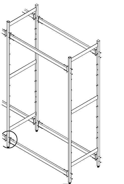 - Dann folgt die Kreuzverstrebung für die benötigten Grundregale, alternativ Längsverbinder (4 Stück pro Regalfeld!), um einen freien Zugang zu beiden Seiten des Grundregales zu ermöglichen.